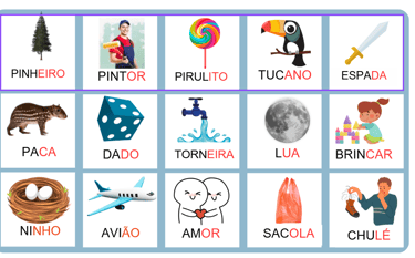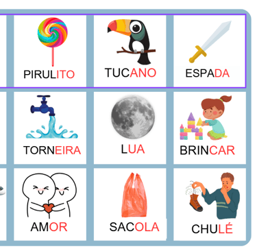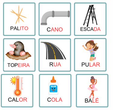 • Palavras simples no formato CV (consoante + vogal), ideal para quem está iniciando a leitura.