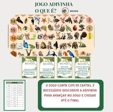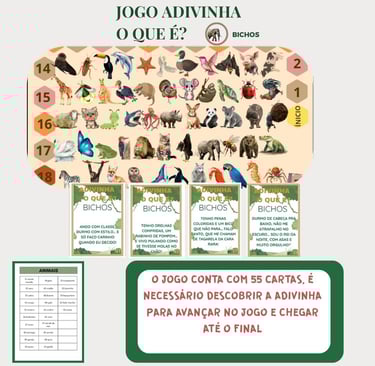 55 cartas de adivinhação com pistas e dicas para adivinhar diferentes animais. Tabuleiro ilustrado com circuito e imagens dos animais, para tornar a brincadeira